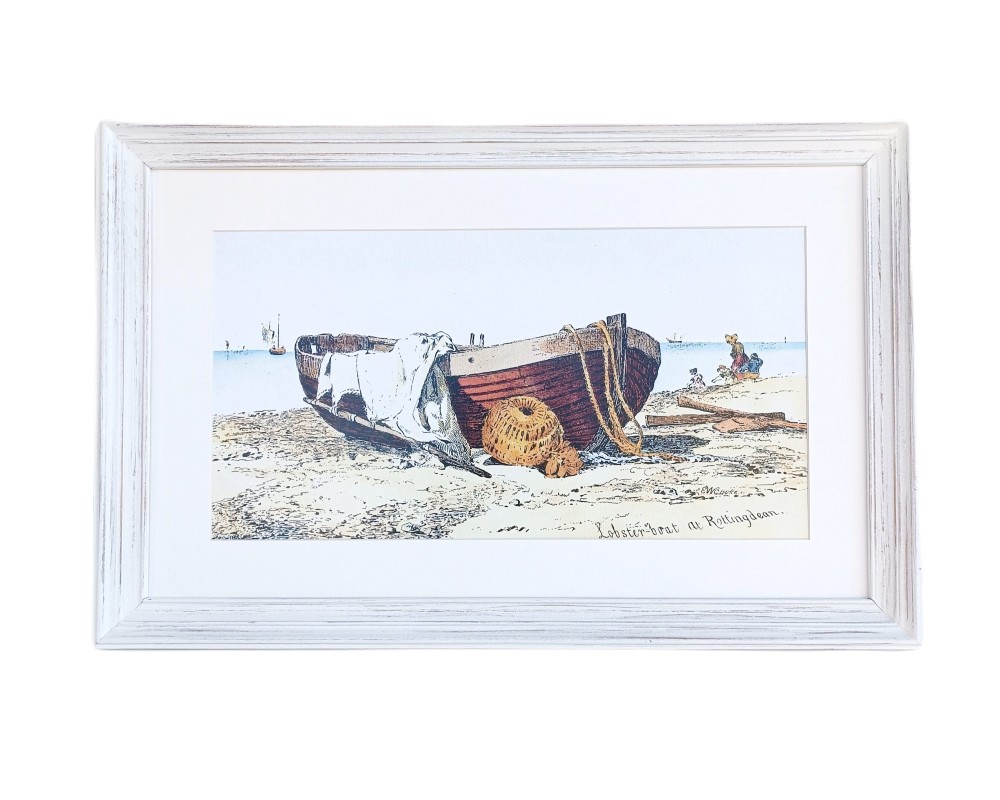 - Διακοσμητικό κάδρο τοίχου με θέμα “Lobster Fishing Boat”, πλαισιωμένο με ξύλινη κορνίζα Chic και πασπαρτού, στην απόχρωση Mare White (λευκό με τεχνητή παλαίωση)