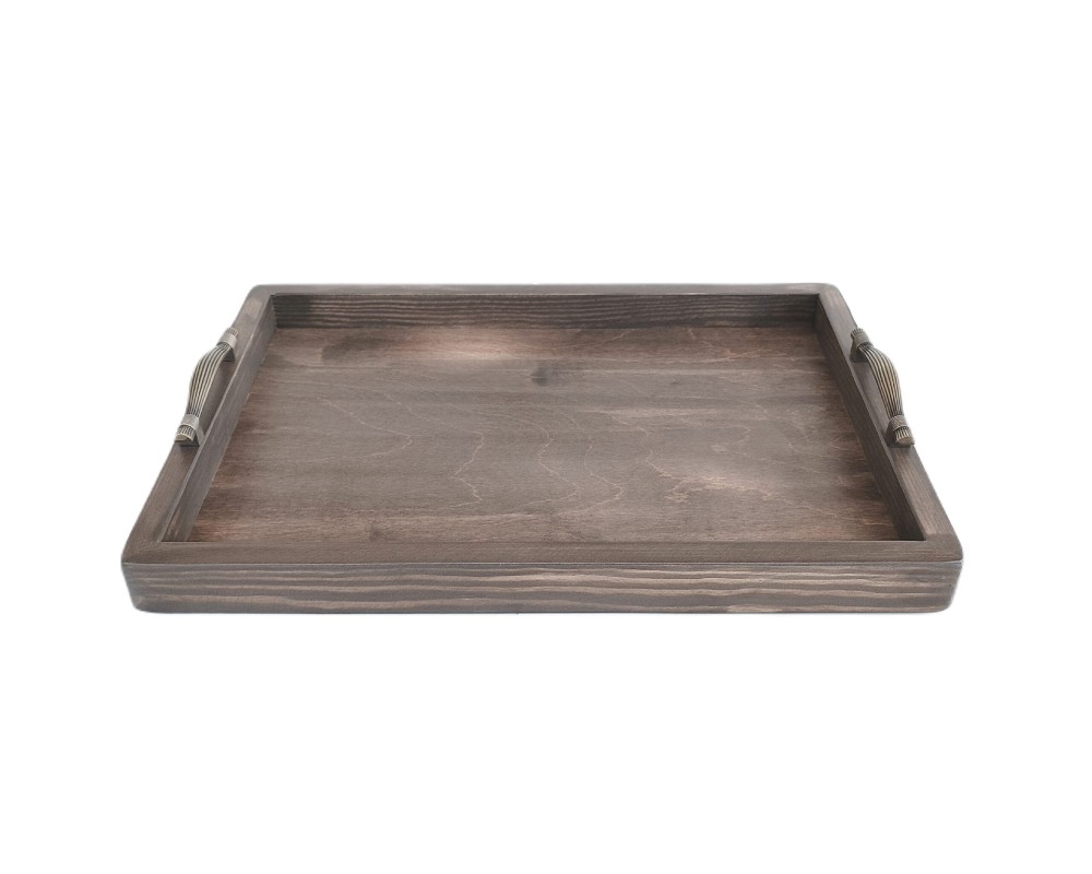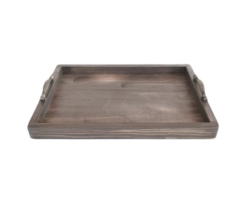 - Ξύλινος δίσκος σερβιρίσματος “Ideal” από πεύκο άροζο με ασημί αντικέ μεταλλικές λαβές στην απόχρωση Taupe (καφέ γκρι)