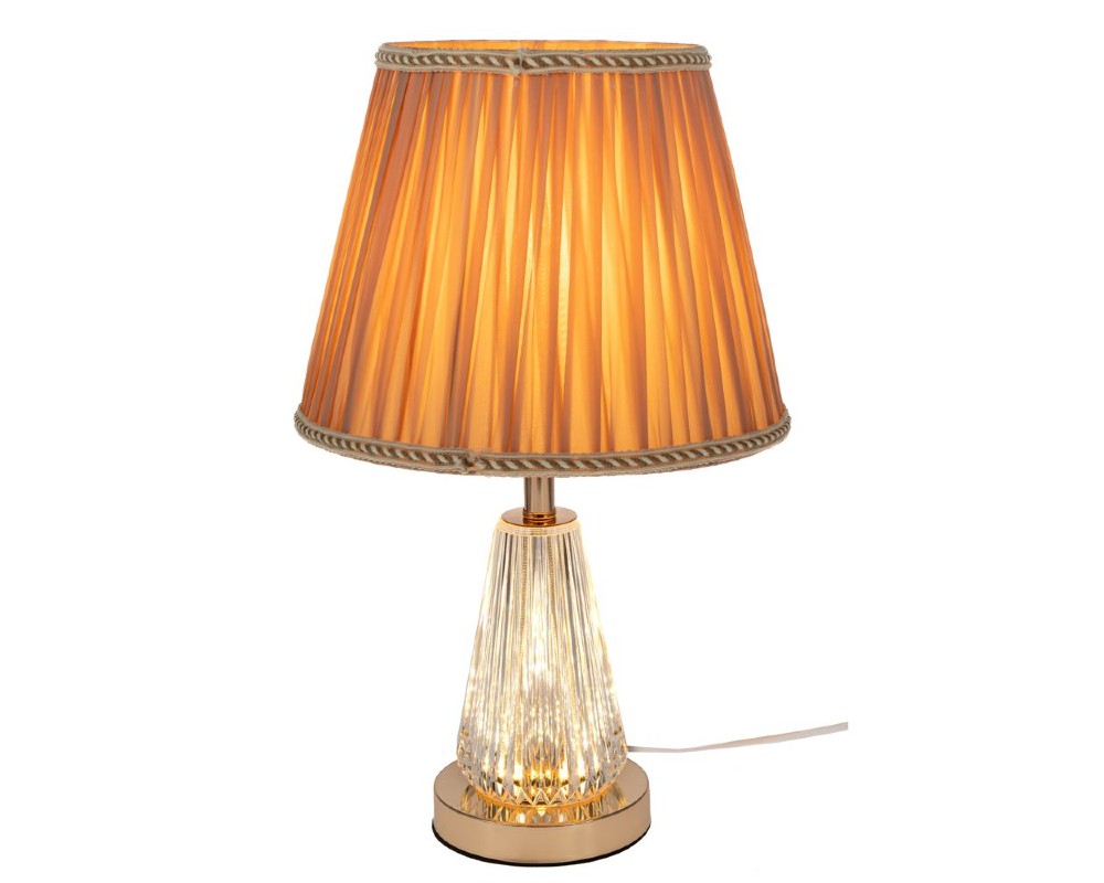 Η διάφανη βάση του διαθέτει ενσωματωμένο φωτισμό, προσφέροντας ατμοσφαιρική λάμψη, ενώ το μπεζ καπέλο διαχέει απαλά το φως, δημιουργώντας ζεστό και φιλόξενο περιβάλλον.