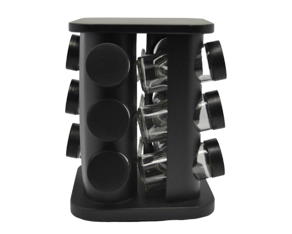 - Βάση μεταλλική περιστρεφόμενη σε μαύρο χρώμα και δώδεκα γυάλινα βαζάκια κατάλληλα για αποθήκευση και συντήρηση μπαχαρικών.