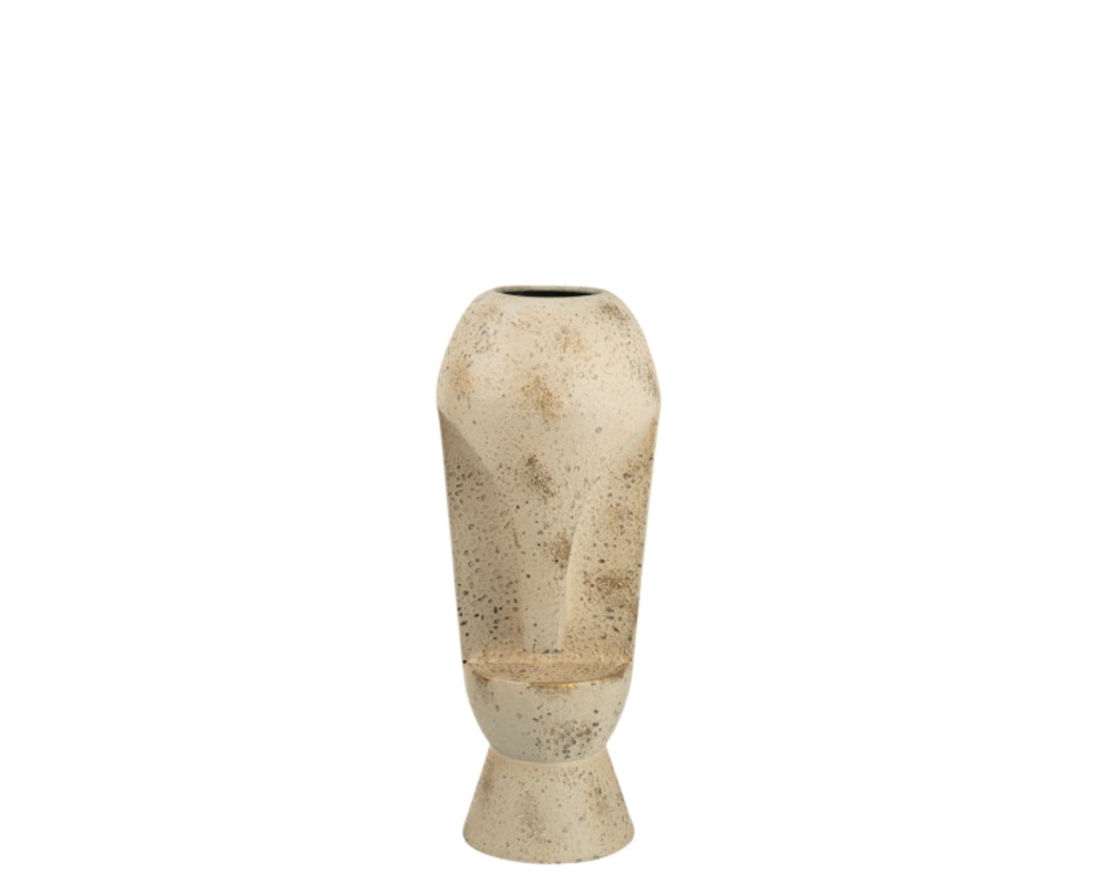 Δώσε καλλιτεχνικό χαρακτήρα στον χώρο σου με αυτό το μεταλλικό βάζο προσώπου σε μπεζ αντικέ απόχρωση, διακοσμημένο με διακριτικές χρυσές πινελιές. Ο γλυπτικός σχεδιασμός του προσδίδει μια ethnic-modern αισθητική, ιδανική για όσους αγαπούν τη διαφορετικότητα στη διακόσμηση.