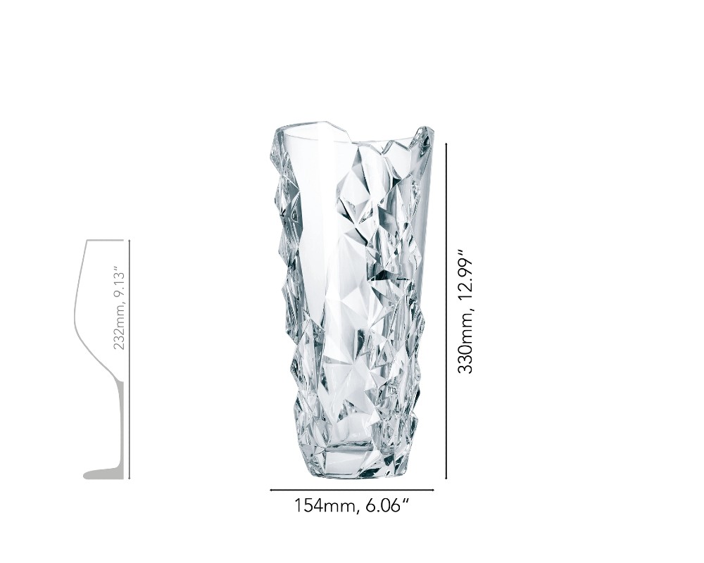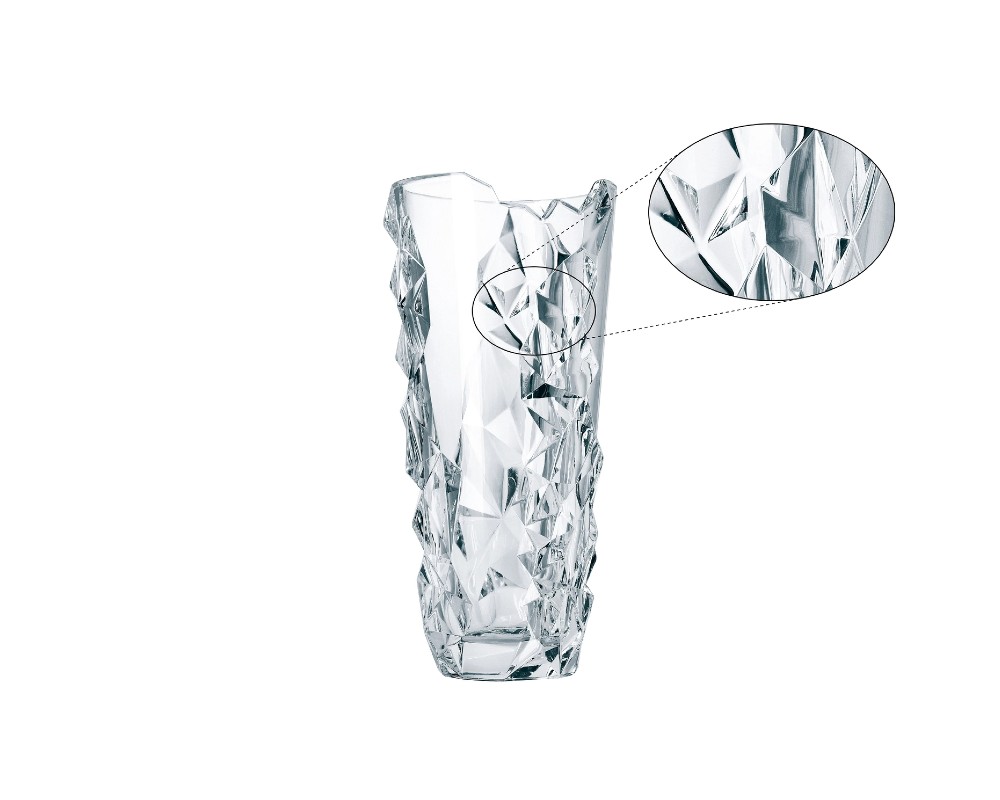 Ο σχεδιασμός του είναι εμπνευσμένος από τη γοητεία του ακατέργαστου βράχου, συνδυάζοντας λείες, αψεγάδιαστες επιφάνειες με μια περίπλοκη γεωμετρική υφή που θυμίζει σμιλεμένη πέτρα. Αυτή η αντίθεση δημιουργεί ένα μοναδικό οπτικό αποτέλεσμα, καθώς το φως διαθλάται και αντανακλάται μέσα από το λαμπερό, υψηλής ποιότητας κρύσταλλο, μεταμορφώνοντας το ανθοδοχείο σε ένα δυναμικό και ζωντανό διακοσμητικό στοιχείο.