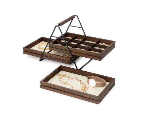 - Κάθε δίσκος έχει διαφορετικό στυλ διαχωριστή, φτιαγμένο για διαφορετικούς τύπους κοσμημάτων και βοηθά στη διατήρηση των δαχτυλιδιών, των βραχιόλια, των σκουλαρίκια και των περιδέραιων ξεχωριστά για βελτιστοποίηση της οργάνωσης