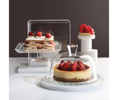 - Τουρτιέρα με μίνιμαλ σχεδιασμό, κατασκευασμένη από διάφανο γυαλί. Ιδανική για να τοποθετήσετε την τούρτα ή τα γλυκά σας σε οποιαδήποτε εορταστική ή καθημερινή περίσταση