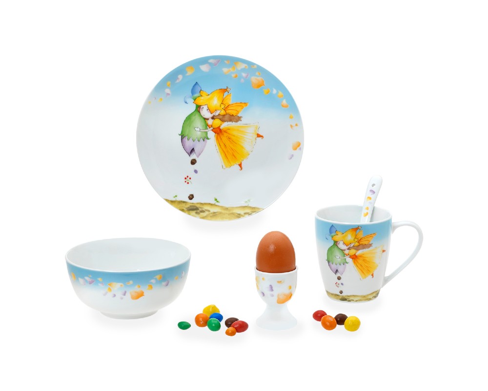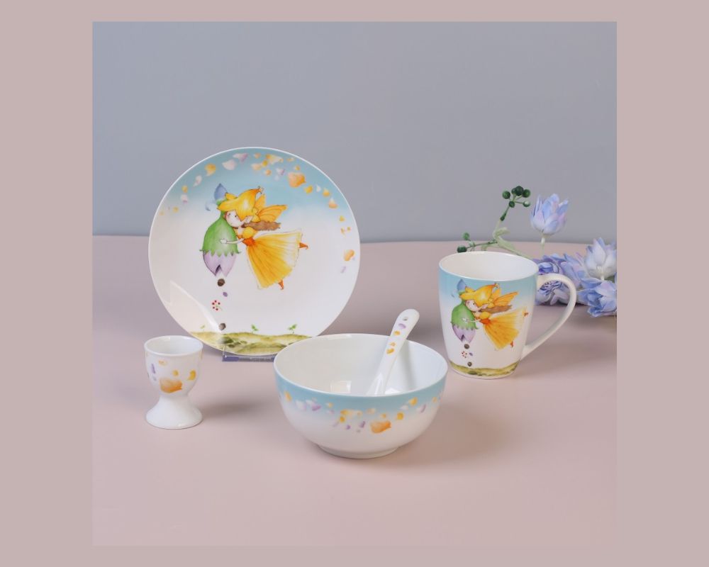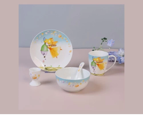 - Πλήρες Σετ 5 Τεμαχίων: Περιλαμβάνει πιάτο, μπολ, κούπα, αυγοθήκη και κουταλάκι.