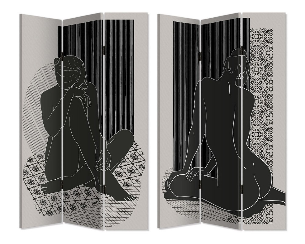 - Διακοσμητικό παραβάν σε ξύλινο πλαίσιο το οποίο αποτελείται από τρία φύλλα