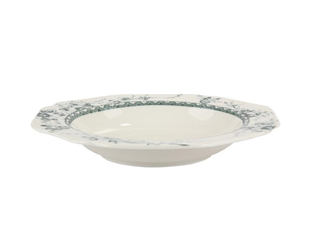 Κατασκευασμένο από ανθεκτική, υψηλής ποιότητας πορσελάνη, το πιάτο διακοσμείται στο χείλος του με το χαρακτηριστικό μοτίβο ανθισμένων κλαδιών σε μια γαλήνια πράσινη απόχρωση. Ο σχεδιασμός του αποπνέει μια αίσθηση φυσικής ομορφιάς και ισορροπίας, μετατρέποντας κάθε απλό πιάτο σε μια ξεχωριστή γαστρονομική εμπειρία.