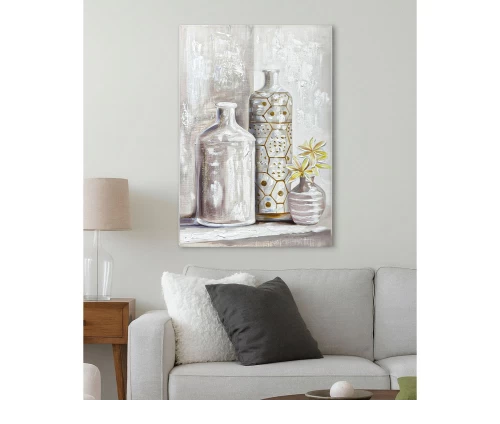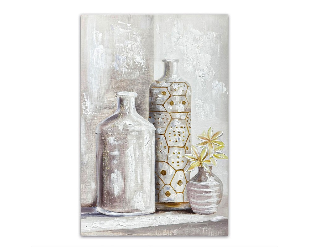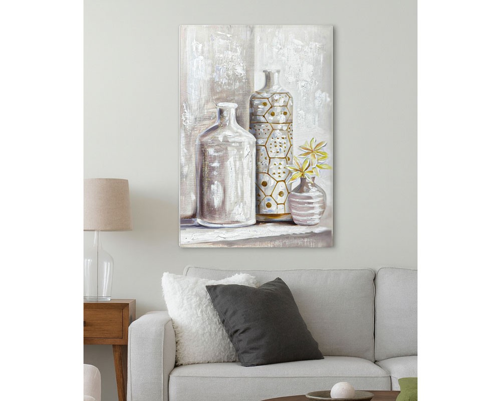Ο πίνακας ελαιογραφία Ankor σε τυπωμένο καμβά παρουσιάζει μια καλλιτεχνική σύνθεση με διακοσμητικά βάζα, σε ουδέτερες αποχρώσεις του λευκού, του μπεζ και του γκρι.