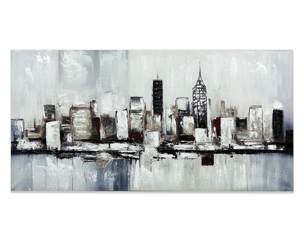 - Πίνακας ελαιογραφία σε τυπωμένο καμβά, που απεικονίζει έναν μοντέρνο ορίζοντα πόλης με αντανακλάσεις στο νερό
