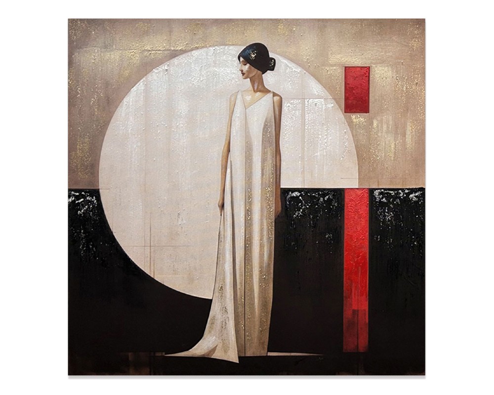 - Πίνακας ελαιογραφία σε τυπωμένο καμβά με κομψή γυναικεία φιγούρα σε γεωμετρικό φόντο. Οι μπεζ, μαύροι και χρυσοί τόνοι αποπνέουν διαχρονική κομψότητα, ενώ οι κόκκινες λεπτομέρειες προσθέτουν ένταση