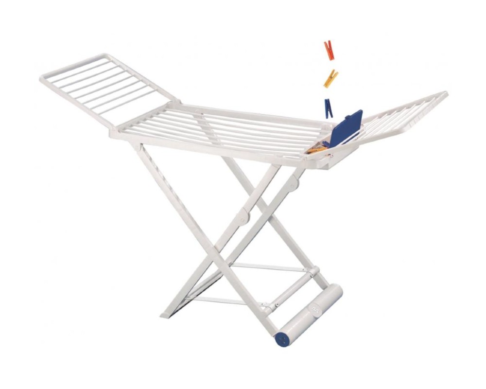 - Σε άσπρο χρώμα, με ροδάκια για εύκολη μετακίνηση, διαθέτει ενσωματωμένο μπλε καλαθάκι για μανταλάκια και διακόπτη ασφαλείας