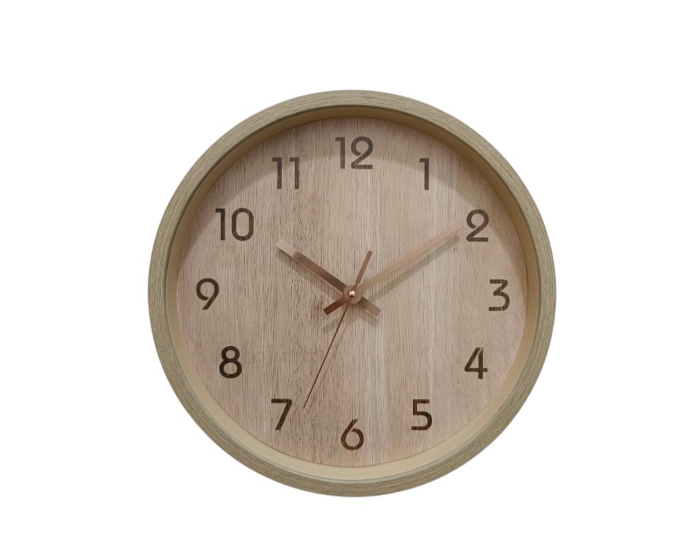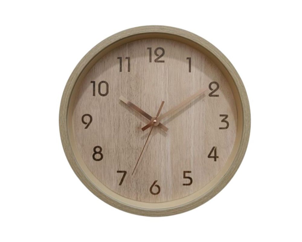 Το Oriana Ferelli W7185‑A είναι στρογγυλό ρολόι τοίχου διαμέτρου 30 εκ., με φωτεινή faux-wood εμφάνιση σε απαλό μπεζ/φυσικό χρώμα, που δημιουργεί ζεστή και σύγχρονη αίσθηση. Ο αναλογικός μηχανισμός quartz είναι αθόρυβος (sweep), ιδανικός για χρήση σε χώρους καθημερινής ηρεμίας όπως σαλόνι ή υπνοδωμάτιο.
