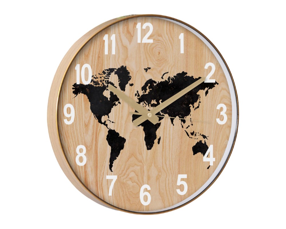 - Ρολόι τοίχου με πλαστικό πλαίσιο και καντράν με ξύλινη όψη, διακοσμημένο με χάρτη του κόσμου σε μαύρο χρώμα