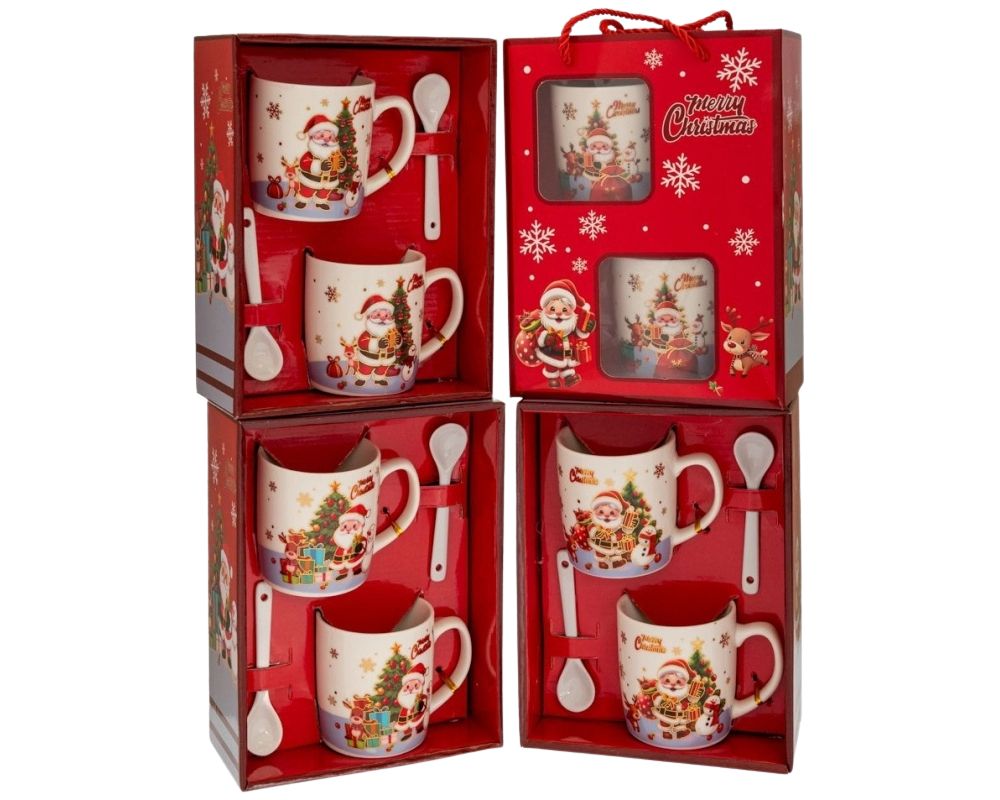 Κάθε κούπα έχει χωρητικότητα 150 ml και είναι διακοσμημένη με γιορτινές παραστάσεις του Άι Βασίλη, προσφέροντας μια χαρούμενη και εορταστική νότα σε κάθε γουλιά. Το σετ συμπληρώνεται από δύο ασορτί κεραμικά κουταλάκια, τα οποία τοποθετούνται έξυπνα στη λαβή της κάθε κούπας.