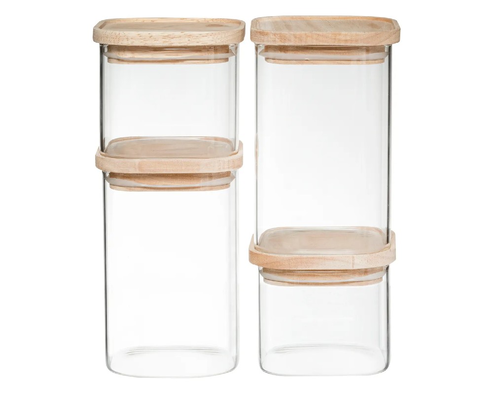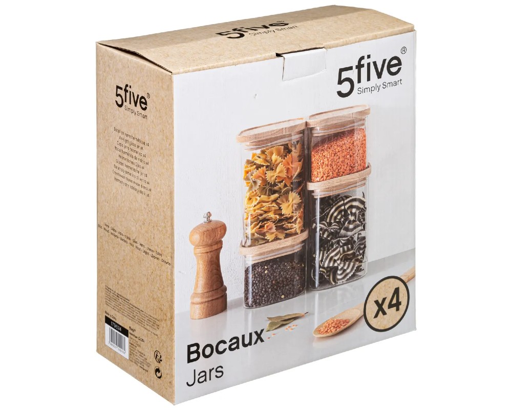Πρόκειται για ένα σετ τεσσάρων στοιβαζόμενων γυάλινων δοχείων αποθήκευσης της εταιρείας 5Five Simply Smart, με κωδικό μοντέλου 179624. Τα βάζα είναι κατασκευασμένα από γυαλί, κατάλληλο για επαφή με τρόφιμα και διαθέτουν καπάκι από ξύλο καουτσουκόδεντρου με σιλικόνη για αεροστεγές κλείσιμο