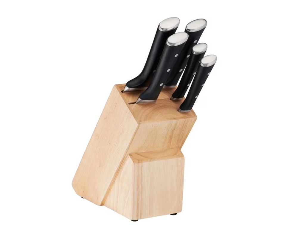 Το σετ συνοδεύεται από κομψή ξύλινη βάση αποθήκευσης, που προστατεύει τα μαχαίρια και προσφέρει άψογο αισθητικό αποτέλεσμα στον πάγκο της κουζίνας.