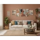 Το κεντρικό κομμάτι, το πορτρέτο, μαγνητίζει το βλέμμα, ενώ οι περιμετρικοί πίνακες το συμπληρώνουν αρμονικά με τις απαλές πινελιές και την ονειρική απεικόνιση της φύσης. Η χρωματική παλέτα κινείται σε γοητευτικούς τόνους του ροζ, του τυρκουάζ, του πράσινου της μέντας και γήινων αποχρώσεων, προσφέροντας ένα αποτέλεσμα που είναι ταυτόχρονα δυναμικό και γαλήνιο. Οι κορνίζες σε χρώμα φυσικού ξύλου ολοκληρώνουν το σύνολο, προσδίδοντας ζεστασιά.