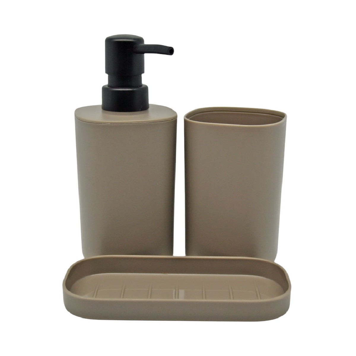 Το σετ περιλαμβάνει dispenser για υγρό σαπούνι, ποτηροθήκη και σαπουνοθήκη. Η ουδέτερη απόχρωση taupe ταιριάζει εύκολα σε φυσικά, minimal ή μοντέρνα μπάνια, προσφέροντας καθαρό και τακτοποιημένο αποτέλεσμα.