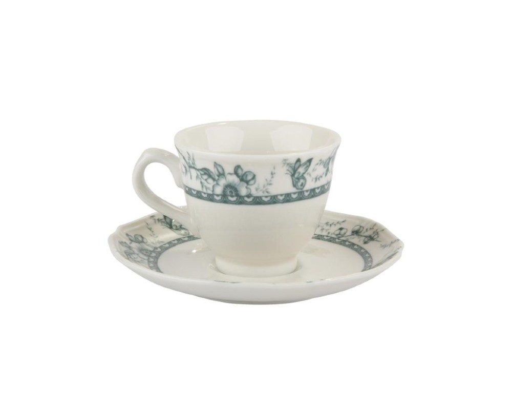 Το φίνο σχέδιο με τα πράσινα άνθη και τα ντελικάτα φύλλα, που στολίζει τόσο το φλυτζάνι όσο και το ασορτί πιατάκι, προσφέρει μια δροσερή, φυσική αντίθεση στην ένταση και το άρωμα του καφέ. Κάθε λεπτομέρεια, από το κομψό χερούλι μέχρι την ποιοτική πορσελάνη, είναι μελετημένη για να σας προσφέρει μια μικρή απόδραση στη φύση, ακόμα κι αν βρίσκεστε στην καρδιά της πόλης.