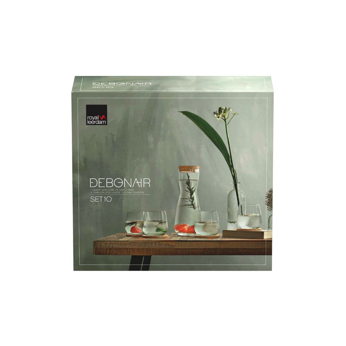 Δώστε στιλ στο καθημερινό σερβίρισμα με το Debonair set της Royal Leerdam: μια κομψή γυάλινη καράφα 1lt με πώμα φελλού, συνδυασμένη με 4 ποτήρια 370ml και 4 σουβέρ από φελλό.