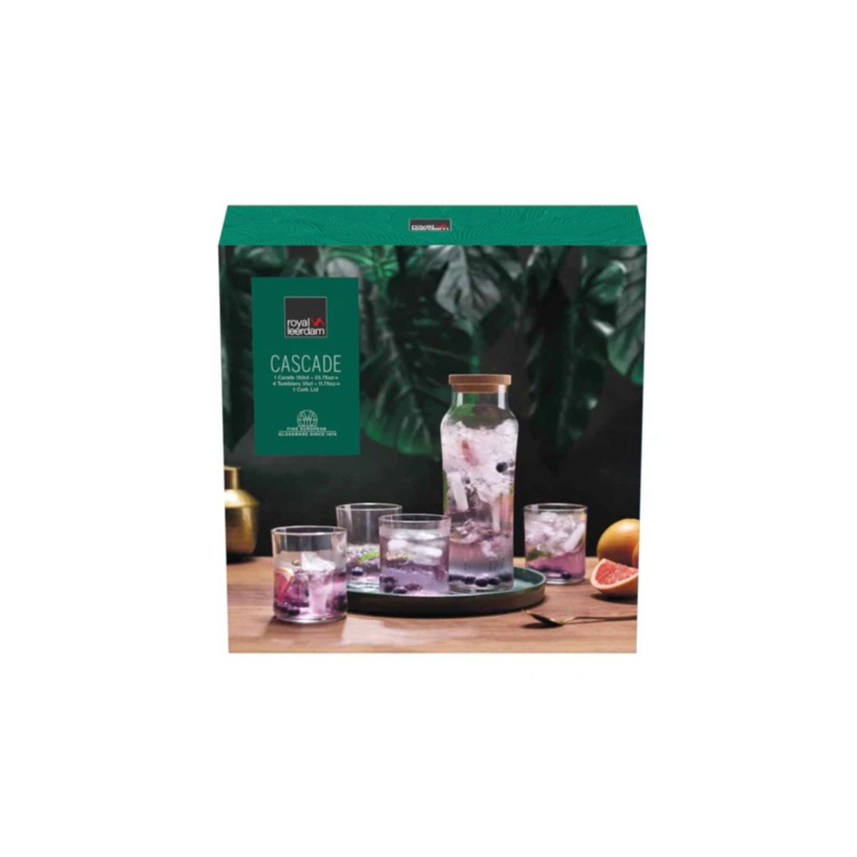 Κομψό και πρακτικό, το Cascade set της Royal Leerdam αναβαθμίζει το καθημερινό σερβίρισμα στο τραπέζι. Περιλαμβάνει γυάλινη καράφα 1lt με πώμα φελλού και 4 ποτήρια 350ml, ιδανικά για νερό, χυμούς, παγωμένο τσάι ή αρωματισμένο νερό (infused).