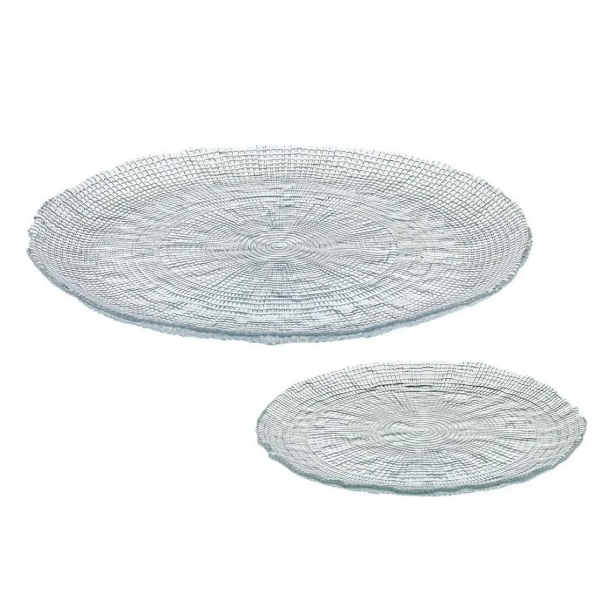Δώστε μια πινελιά πολυτέλειας στο τραπέζι σας με αυτό το ξεχωριστό γυάλινο σετ πάστας από το liveyourhome. Ο ιδιαίτερος, ανάγλυφος σχεδιασμός του που θυμίζει πλέξη καμβά, σε συνδυασμό με το ακανόνιστο, οργανικό τελείωμα στις άκρες, δημιουργεί ένα υπέροχο αισθητικό αποτέλεσμα που τραβάει τα βλέμματα.