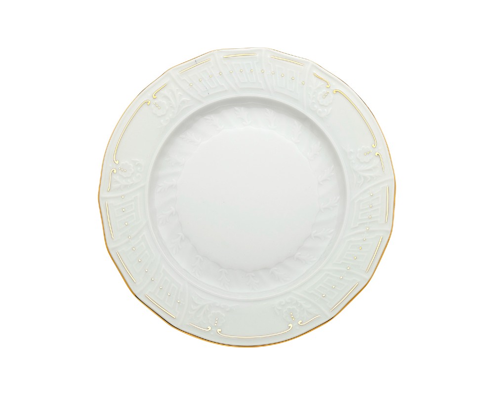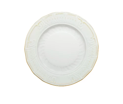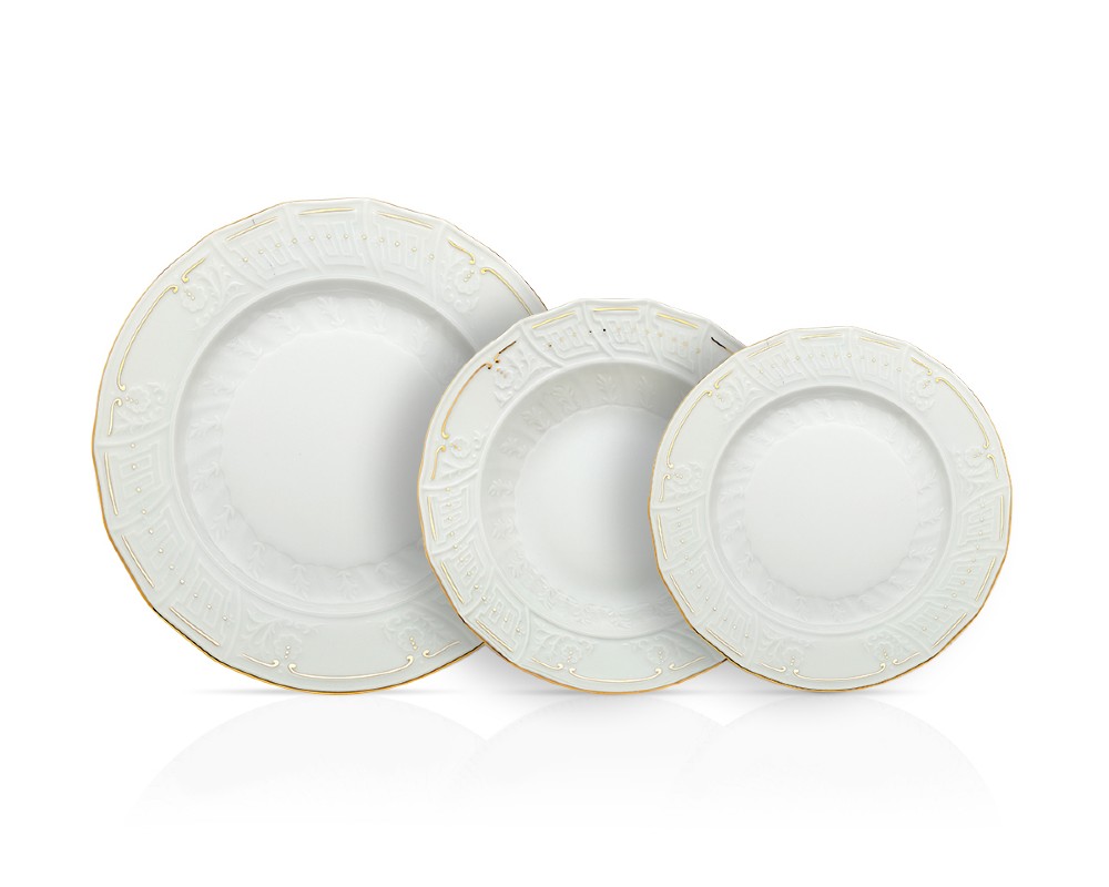 Το σχέδιο Karyatis αποπνέει κλασική ομορφιά, με διακριτικές ανάγλυφες λεπτομέρειες που αγκαλιάζουν την περιφέρεια κάθε πιάτου. Η διακόσμηση ολοκληρώνεται στην Ελλάδα με μια εκλεπτυσμένη γραμμή και πινελιές χρυσού, προσδίδοντας μια νότα αρχοντικής λάμψης στο τραπέζι σας.