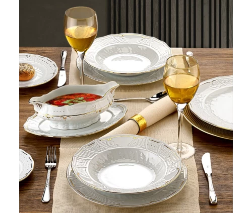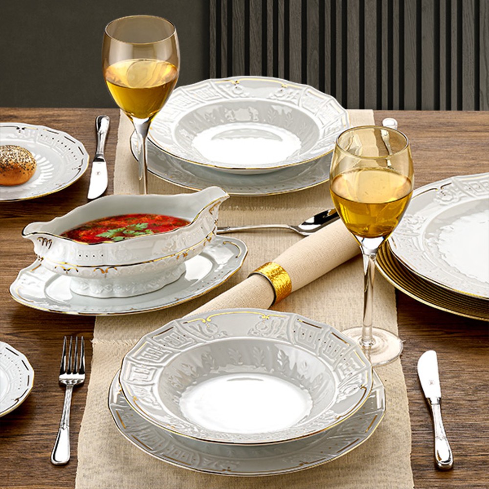 Αναβαθμίστε την τέχνη του σερβιρίσματος και μετατρέψτε κάθε γεύμα σε μια μοναδική εμπειρία πολυτέλειας με το εντυπωσιακό σετ φαγητού Karyatis Oro. Κατασκευασμένο από εκλεκτή, ανάγλυφη πορσελάνη ευρωπαϊκής προέλευσης, κάθε κομμάτι αυτού του σετ αποπνέει διαχρονική φινέτσα.