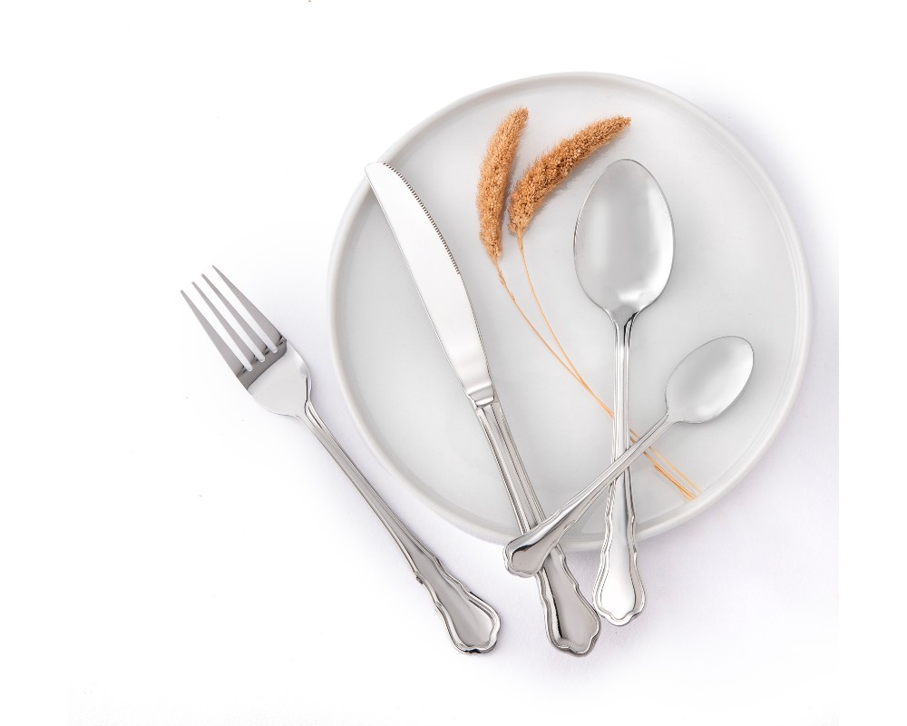 - Το σετ περιλαμβάνει: 6 πιρούνια φαγητού (210 mm), 6 κουτάλια φαγητού (205 mm), 6 μαχαίρια φαγητού (240 mm) και 6 κουτάλια γλυκού (148 mm)