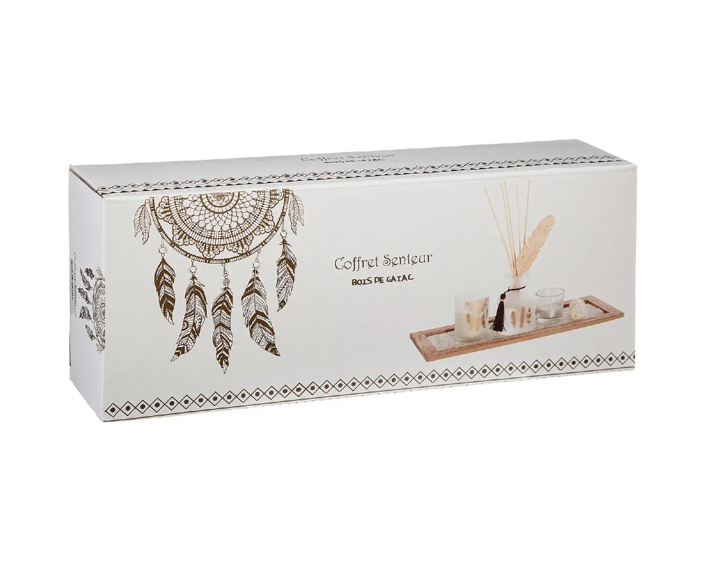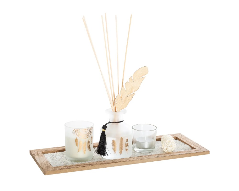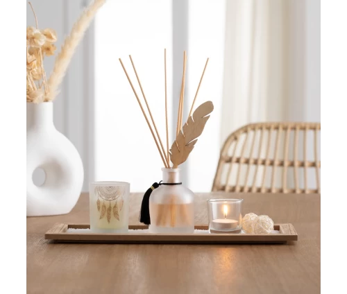 - Σετ αρωματικών σε δισκάκι που θα ανανεώσουν την ατμόσφαιρα και θα χαρίσουν φρεσκάδα στο χώρο σας. Το σετ αποτελείται από 1 κερί, 1 υγρό (100 ml) με 5 στικς και 1 κηροπήγιο για ρεσώ. Το κερί έχει διάρκεια καύσης περίπου 20 ώρες. Το υγρό και τα στικς διαχέουν άρωμα στο χώρο περίπου έως 4 εβδομάδες.