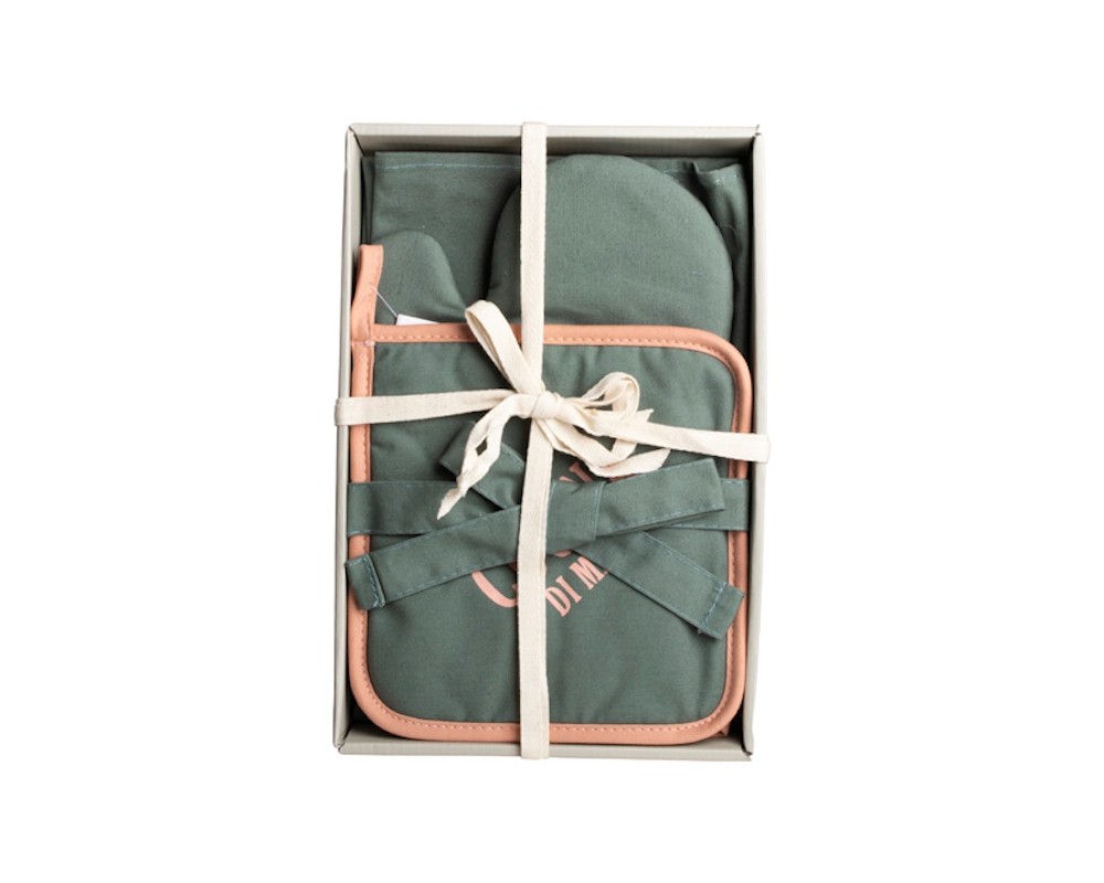 - Κομψό σετ σε σκούρο πράσινο χρώμα αποτελείται από ποδιά, πιάστρα και γάντι φούρνου