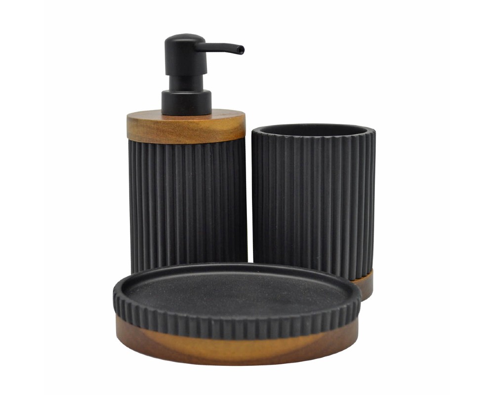 - Το σετ περιλαμβάνει: αντλία υγρού σαπουνιού (7,9 χ 17,5 εκ.), ποτηράκι για οδοντόβουρτσες (8 χ 11 εκ.) και σαπουνοθήκη (9,3x13,8x2,9εκ.)