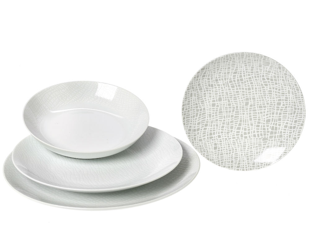 - Πορσελάνη εξαιρετικής ποιότητας με την εγγύηση της Cryspo Trio και υπέροχο ανάγλυφο σχέδιο σε λευκό (ρηχό, βαθύ) και γκρι χρώμα (φρούτου πιατέλα)