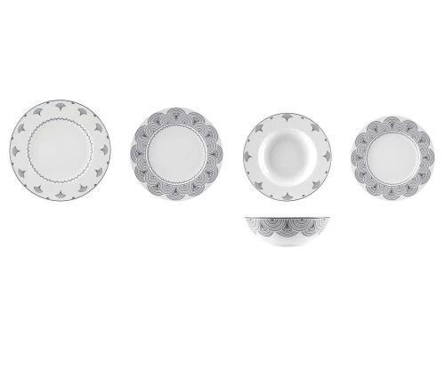 - Το σετ περιλαμβάνει: 6 πιάτα ρηχά, 6 πιάτα βαθιά, 6 πιάτα φρούτου, πιατέλα στρογγυλή και σαλατιέρα