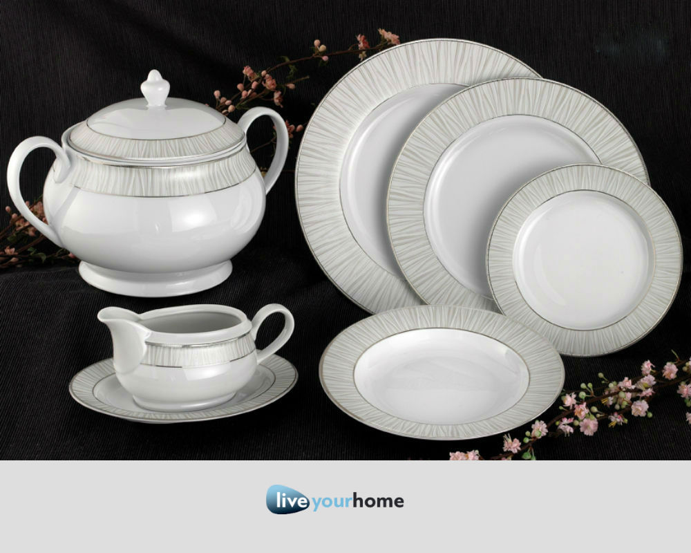 - Το σετ περιλαμβάνει: 24 πιάτα ρηχά, 12 πιάτα βαθιά, 24 πιάτα φρούτου, 4 πιατέλες, 2 σαλατιέρες, 4 ραβιέρες, σουπιέρα και σαλτσιέρα