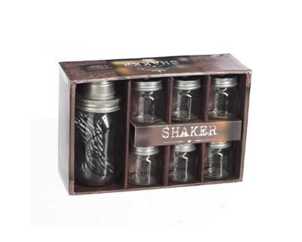 Το σετ περιλαμβάνει: γυάλινο σεικερ 500 ml, 6 γυάλινα ποτηράκια για σφηνάκι (6 χ 5 εκ.), μεταλλικά καπάκια και καλαμάκια