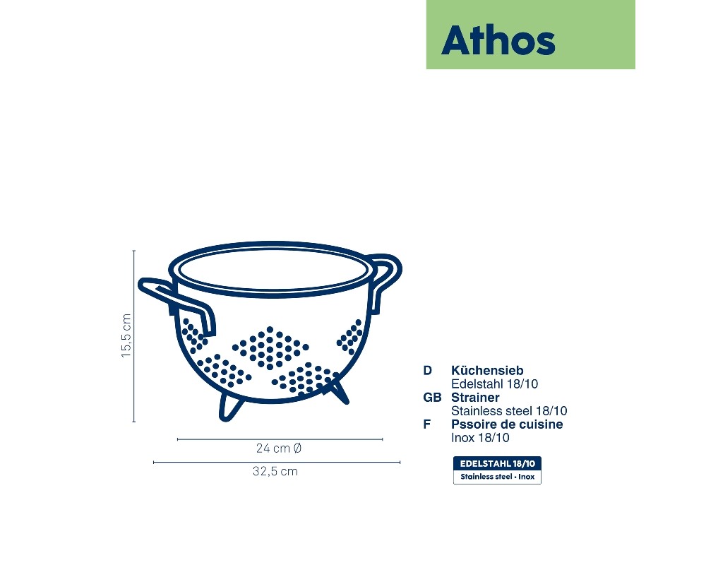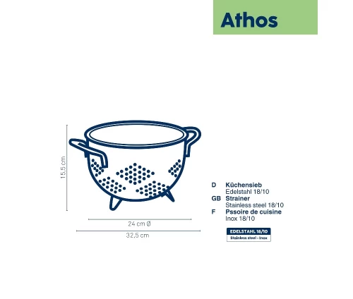 Είτε θέλετε να στραγγίξετε τα αγαπημένα σας ζυμαρικά, να πλύνετε φρέσκα φρούτα και λαχανικά ή να προετοιμάσετε μια δροσερή σαλάτα, το σουρωτήρι Athos είναι ο σύμμαχός σας. Ο σχεδιασμός του δεν είναι μόνο πρακτικός αλλά και αισθητικά εντυπωσιακός, με μια κομψή ματ επιφάνεια εξωτερικά και γυαλιστερό φινίρισμα εσωτερικά που θα προσθέσει μια πινελιά επαγγελματισμού στην κουζίνα σας.