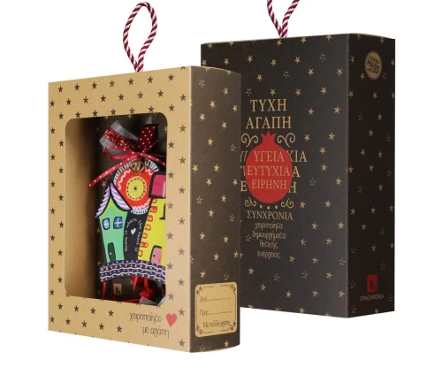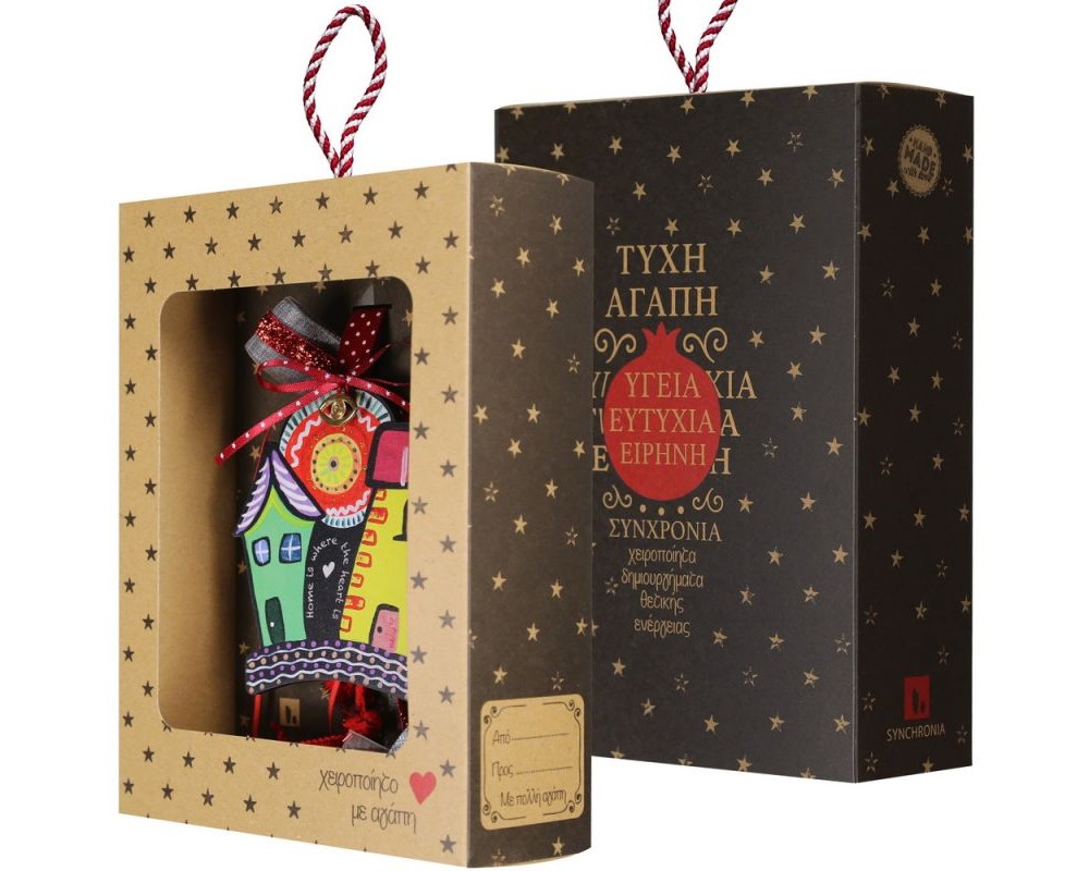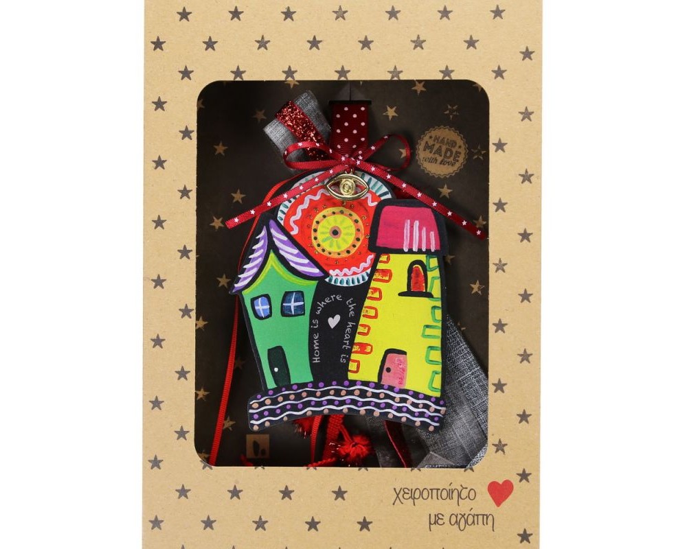 Φέτος χαρίστε χαμόγελα με αυτό το χειροποίητο γούρι σπιτάκι της Synchronia. Το κεντρικό ξύλινο στοιχείο είναι ζωγραφισμένο με πολύχρωμο, καλλιτεχνικό σχέδιο, δημιουργώντας ένα χαρούμενο και παιχνιδιάρικο αποτέλεσμα που ξεχωρίζει.