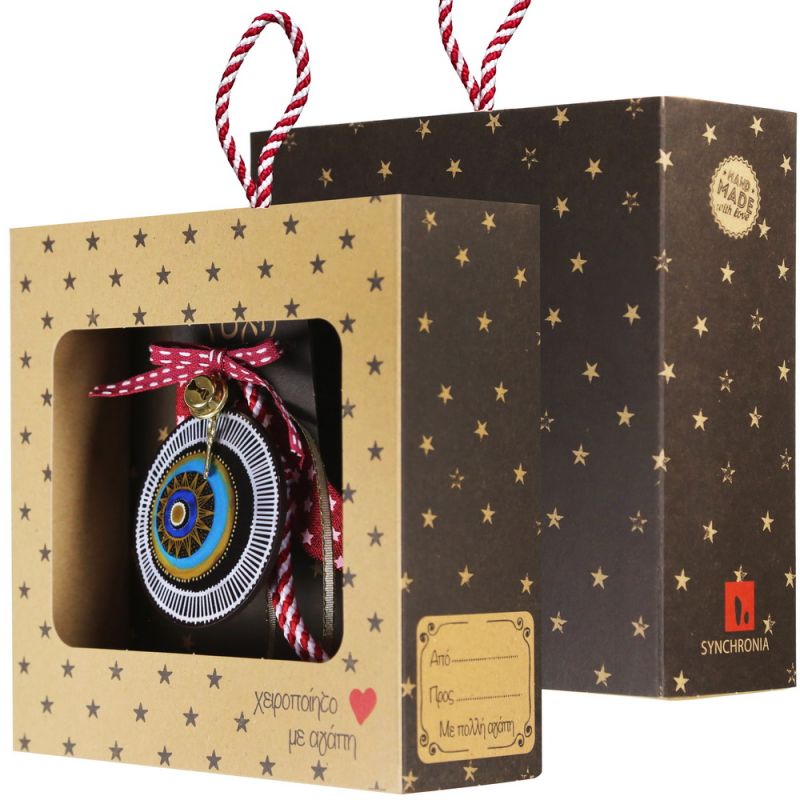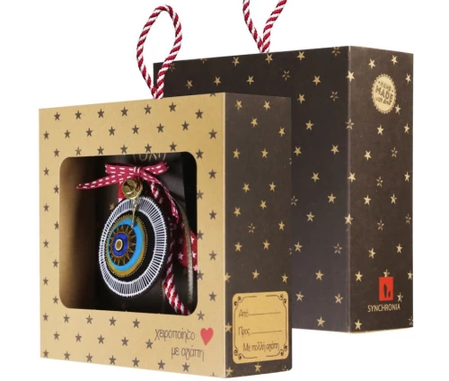 Χειροποίητο γιορτινό γούρι Mystic Eye από ξύλο. Ιδανική επιλογή για χριστουγεννιάτικο δώρο σε φίλους ή οικογένεια. Μπορεί να κρεμαστεί σε πόρτα, δέντρο ή τοίχο και δίνει μια χαρούμενη πινελιά στη διακόσμηση. Συνοδεύεται από έτοιμη συσκευασία δώρου.