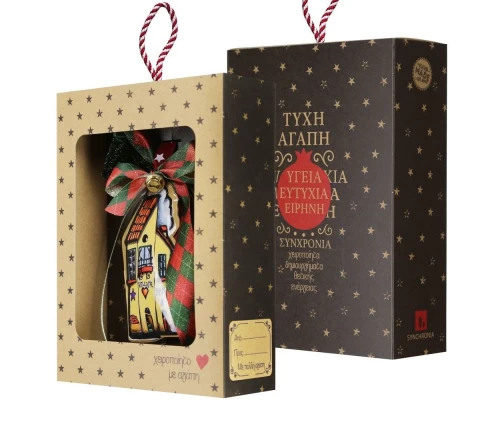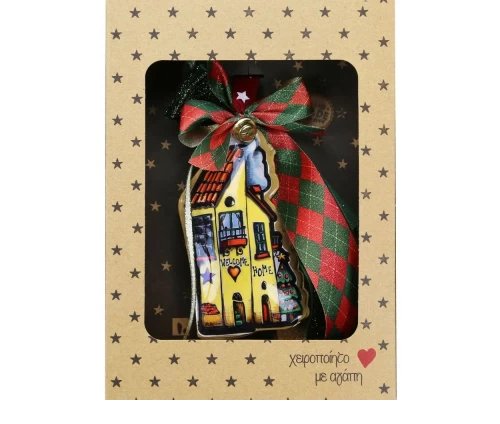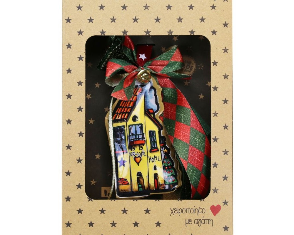 Χειροποίητο γούρι με μεταλλικό σπιτάκι, ζωγραφισμένο και στις δύο πλευρές σε γιορτινές αποχρώσεις. Διακοσμημένο με καρό κορδέλα και μεταλλικό κουδουνάκι. Ιδανικό ως χριστουγεννιάτικο δώρο για τους αγαπημένους σας.
