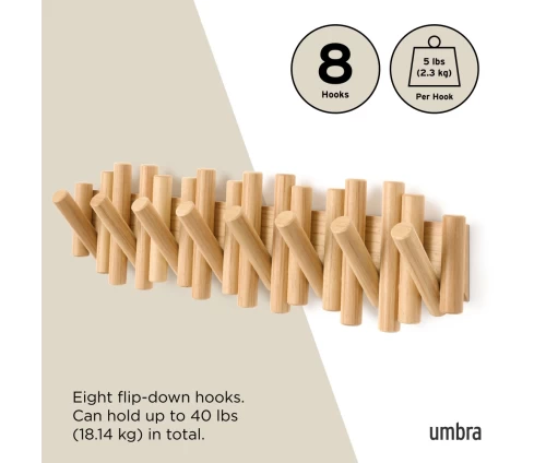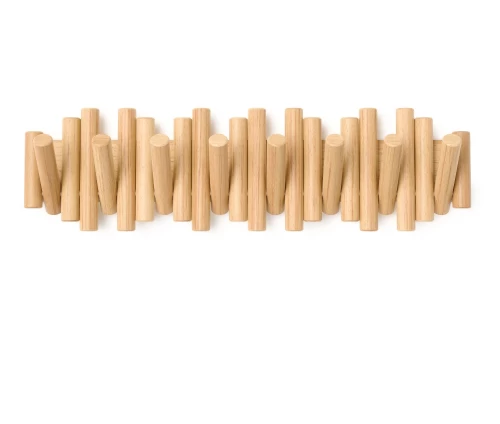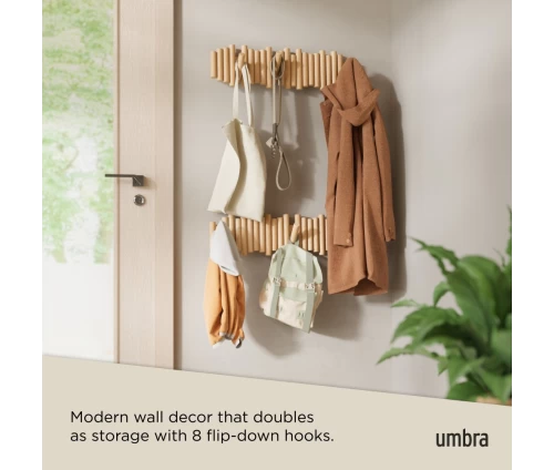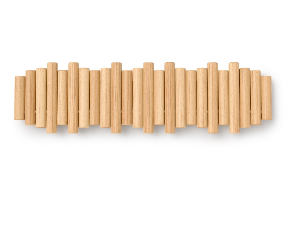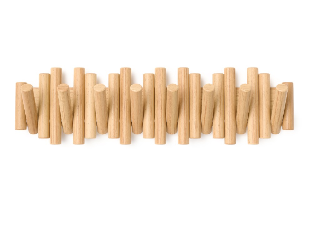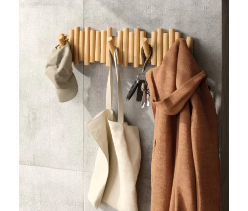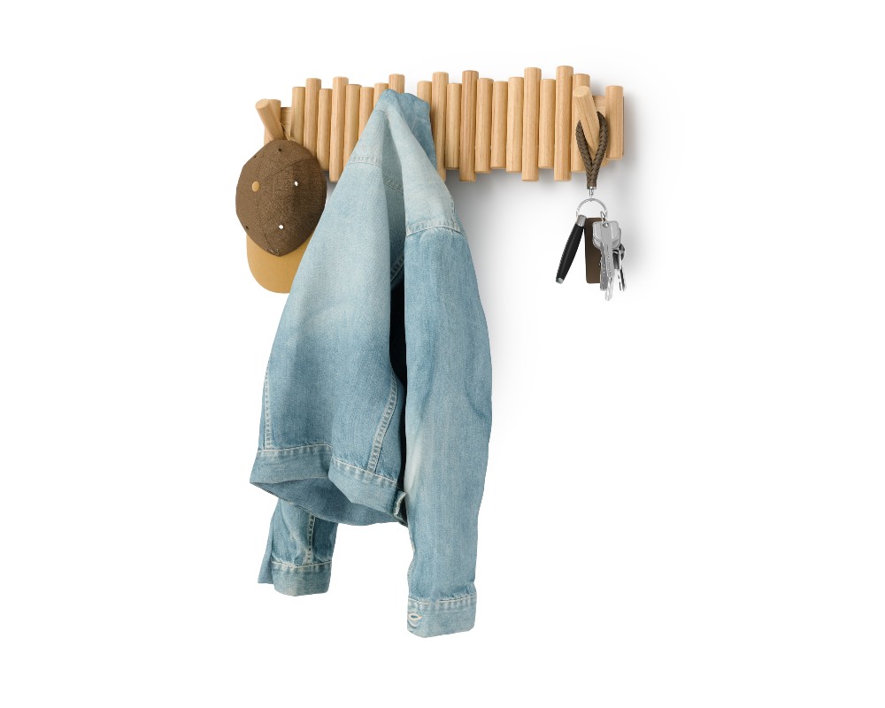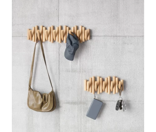 Με την πρώτη ματιά, η Picket μοιάζει με μια τρισδιάστατη ξύλινη σύνθεση στον τοίχο. Οι οκτώ λοξότμητοι πύροι από μασίφ ξύλο δημιουργούν μια αίσθηση γλυπτού. Όταν όμως χρειάζεστε επιπλέον χώρο, οι πύροι μετατρέπονται με μια απλή κίνηση σε ανθεκτικούς, αναδιπλούμενους γάντζους, έτοιμους να φιλοξενήσουν τα πάντα, από παλτό και τσάντες μέχρι κασκόλ και κλειδιά.