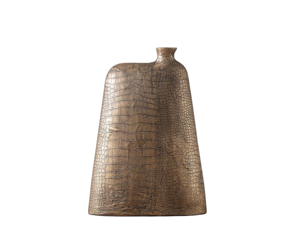 Η χαρακτηριστική ανάγλυφη επιφάνειά του, που αναπαριστά με εκπληκτική λεπτομέρεια το δέρμα κροκόδειλου, του προσδίδει έναν μοναδικό, δυναμικό χαρακτήρα. Το ζεστό, μπρονζέ-χρυσό φινίρισμα αντανακλά το φως, δημιουργώντας μια ατμόσφαιρα ζεστασιάς και φινέτσας. Το ασύμμετρο, γλυπτικό του σχήμα το καθιστά ένα αυτόνομο έργο τέχνης.