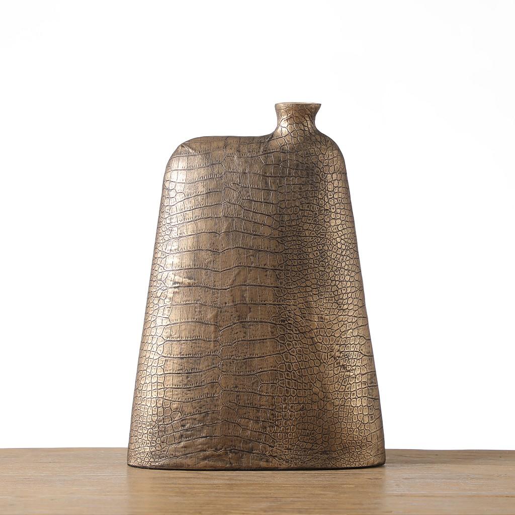 Το μοναδικό του σχήμα, σε συνδυασμό με την εντυπωσιακή ανάγλυφη επιφάνεια που μιμείται την υφή του δέρματος κροκόδειλου, δημιουργεί ένα αίσθημα εξωτικής πολυτέλειας. Η πλούσια μπρονζέ-χρυσή απόχρωση προσδίδει ζεστασιά και λάμψη, κάνοντάς το ιδανικό για να τοποθετηθεί σε κονσόλες, μπουφέδες ή τραπεζαρίες.