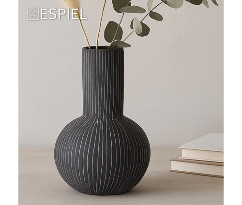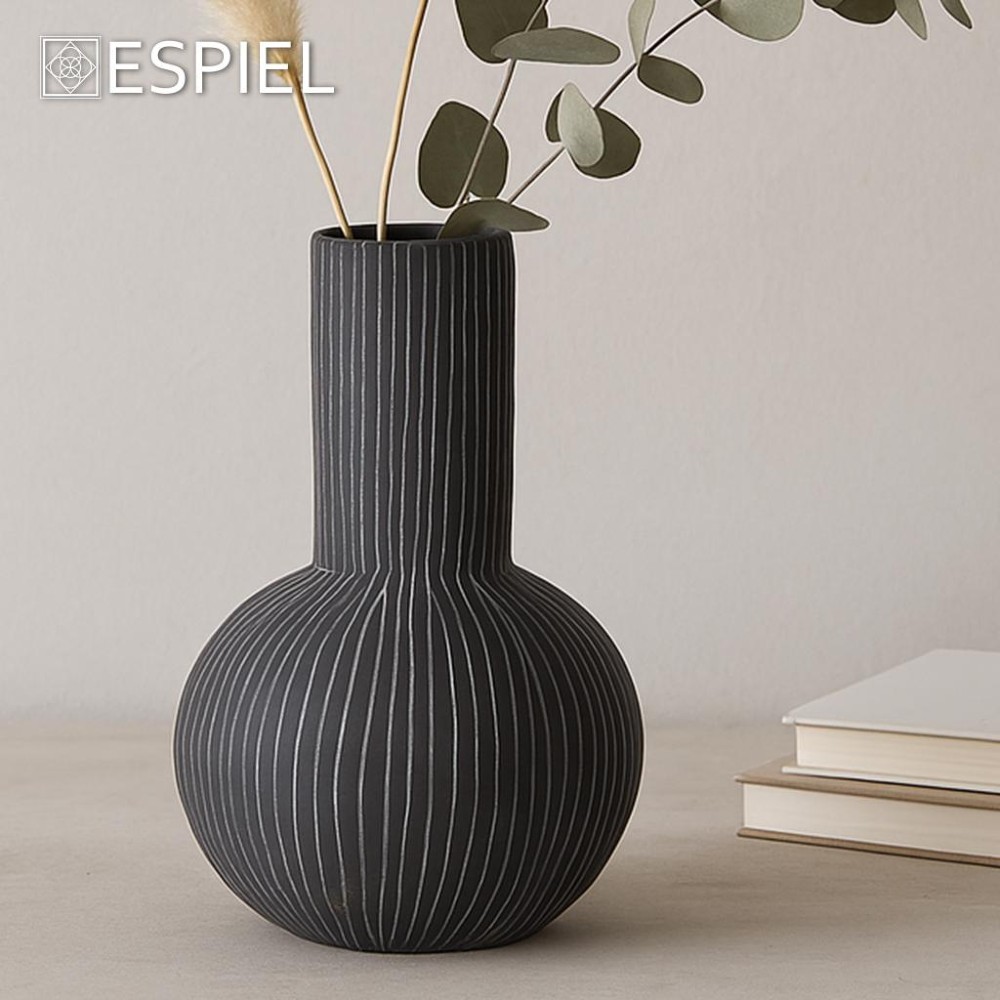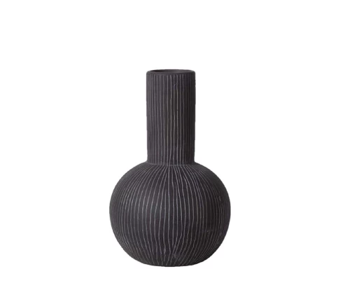 Αυτό το βάζο συνδυάζει τέλεια τη μοντέρνα αισθητική με ένα γήινο, χειροποίητο ύφος. Η βαθιά ανθρακί του απόχρωση τονίζεται από τις κάθετες, σκαλιστές γραμμές που καλύπτουν όλη την επιφάνειά του, από τη σφαιρική βάση μέχρι τον ψηλό λαιμό. Το αποτέλεσμα είναι ένα διακοσμητικό αντικείμενο που "ζωντανεύει" καθώς παίζει με το φως.
