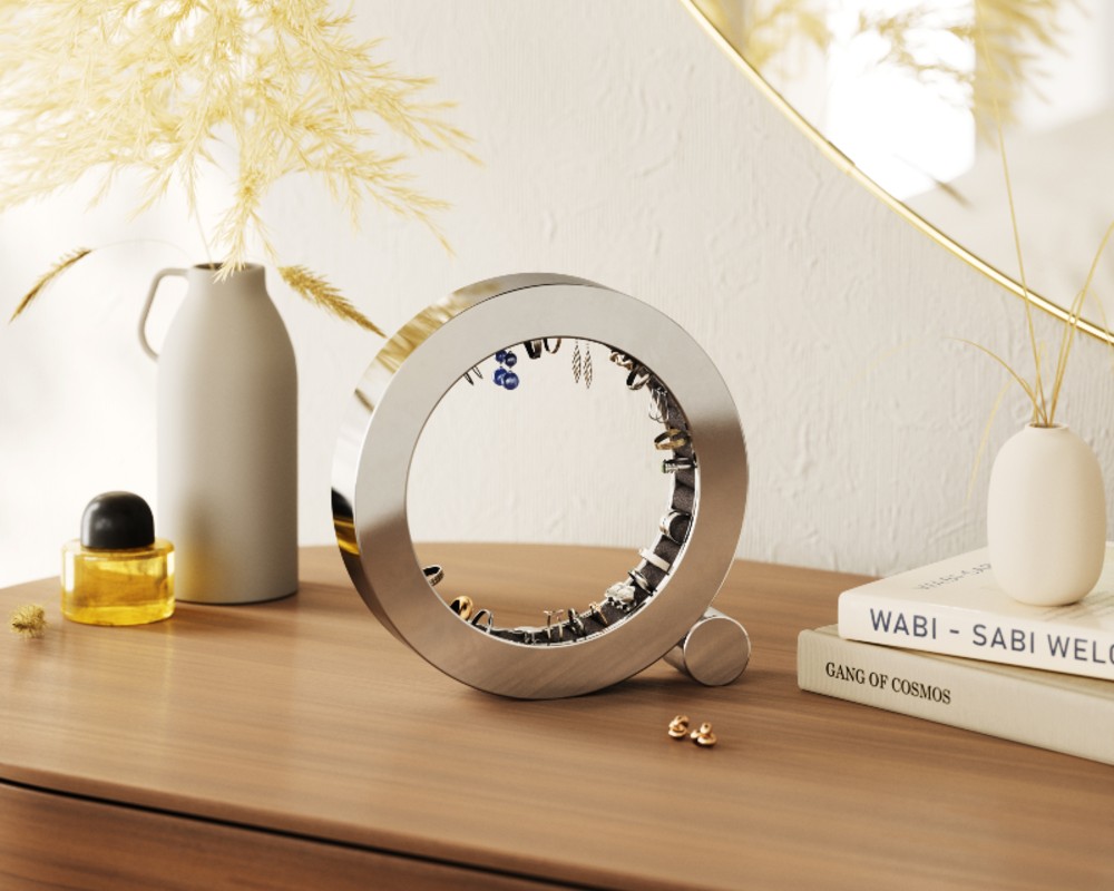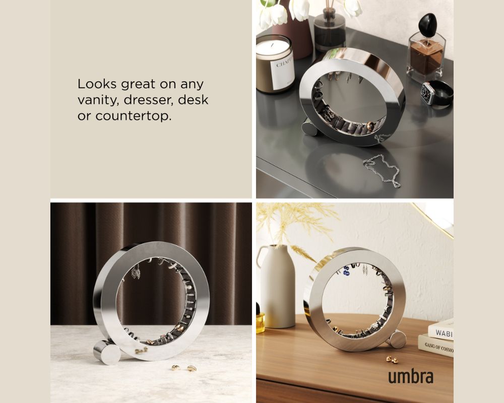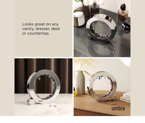 Παρουσιάστε τα αγαπημένα σας κοσμήματα με στυλ, χρησιμοποιώντας την εντυπωσιακή βάση οργάνωσης Ferris από την Umbra. Με τον μοντέρνο, γλυπτό σχεδιασμό της και το λαμπερό φινίρισμα γυαλισμένου αλουμινίου (chrome), αυτή η βάση δεν είναι απλώς ένα αξεσουάρ οργάνωσης, αλλά ένα πραγματικό statement piece για το μπουντουάρ, το κομοδίνο ή τη συρταριέρα σας.