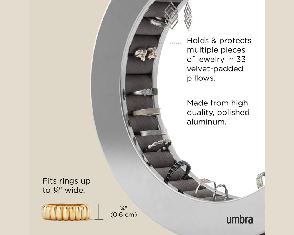 - Μεγάλη Χωρητικότητα: Προσφέρει άφθονο χώρο για να οργανώσετε πολλαπλά δαχτυλίδια (χωράει έως και 33 δαχτυλίδια/ζευγάρια σκουλαρίκια).