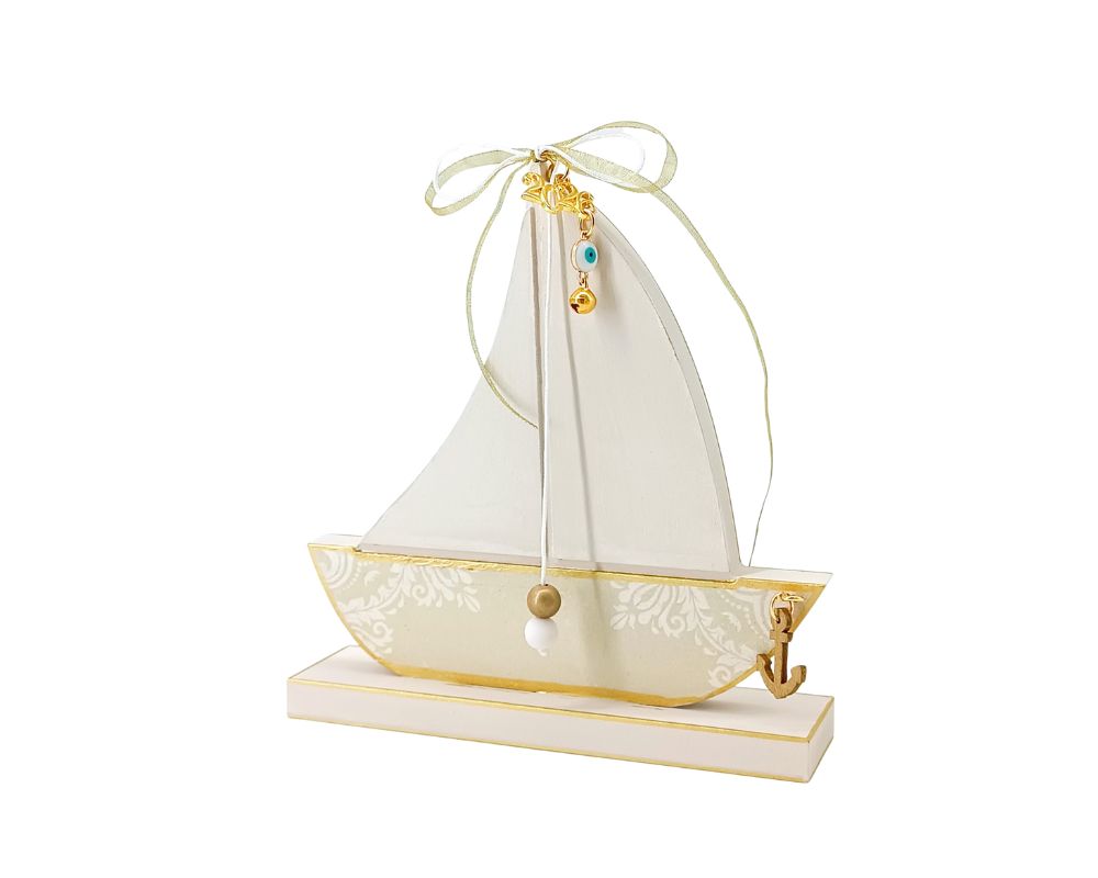 Κατασκευασμένο εξ ολοκλήρου από ξύλο Mdf, το καραβάκι στηρίζεται σε σταθερή βάση και είναι διακοσμημένο με την τεχνική του decoupage, που χαρίζει στο κύτος του ένα όμορφο, φλοράλ vintage μοτίβο. Η προσοχή στη λεπτομέρεια φαίνεται στις κομψές χάντρες, τις φίνες κορδέλες και τα συμβολικά μεταλλικά στοιχεία, όπως το ματάκι για καλή τύχη και η χρυσή άγκυρα.