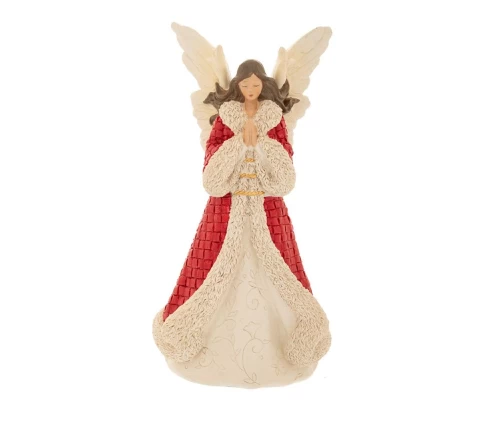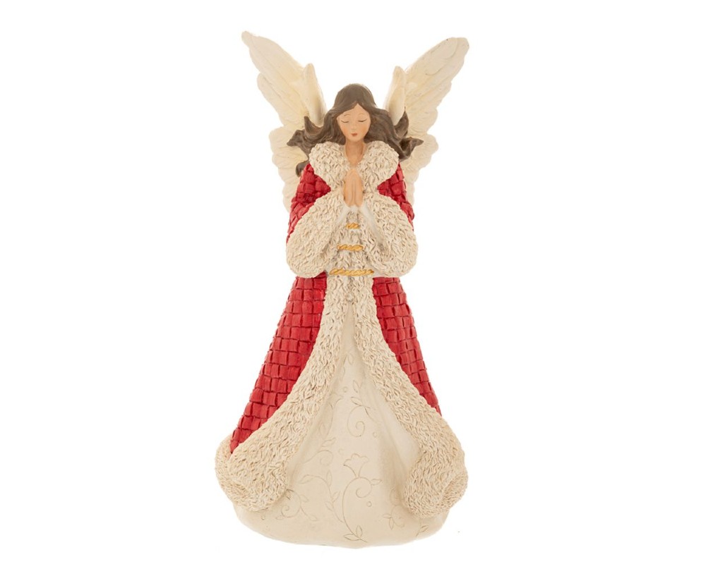 Προσθέστε μια γαλήνια και καλαίσθητη νότα στη χριστουγεννιάτικη διακόσμηση σας με αυτόν τον κομψό άγγελο από πολυρεζίν. Ντυμένος με μπεζ και κόκκινο ένδυμα με ανάγλυφη υφή και χρυσές λεπτομέρειες, απεικονίζεται σε στάση προσευχής με ανοιχτά φτερά, αποπνέοντας ηρεμία.