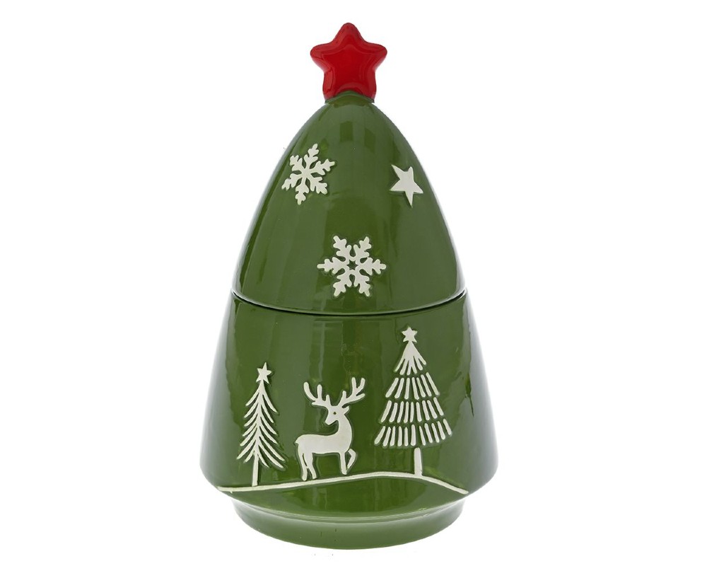 Φέρτε γιορτινή ζεστασιά στην κουζίνα ή το σαλόνι σας με αυτή τη χαριτωμένη κεραμική μπισκοτιέρα σε σχήμα χριστουγεννιάτικου δέντρου. Με πράσινη γυαλιστερή επιφάνεια, λευκά ανάγλυφα σχέδια από δέντρα και ελαφάκι και καπάκι με κόκκινο αστεράκι, είναι ιδανική για να φυλάξετε: