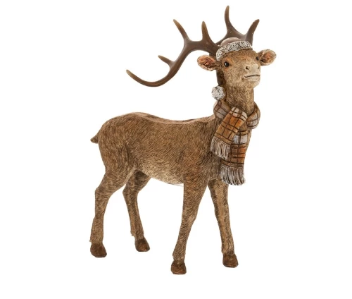 Δώστε ζεστασιά στη χριστουγεννιάτικη διακόσμηση με αυτό το κομψό διακοσμητικό ελάφι από πολυρεζίν. Η φυσική καφέ υφή του και το χειμωνιάτικο κασκόλ/σκουφάκι δημιουργούν ένα ζεστό, ρουστίκ αποτέλεσμα που ταιριάζει σε σαλόνι, είσοδο ή βιτρίνα καταστήματος. Ιδανικό ως κεντρικό στοιχείο σε γιορτινές συνθέσεις, δίπλα σε φωτάκια, κουκουνάρια και κεράκια. Ανθεκτική κατασκευή, λεπτομερής σχεδίαση και διαχρονικό στυλ για πολλά Χριστούγεννα.